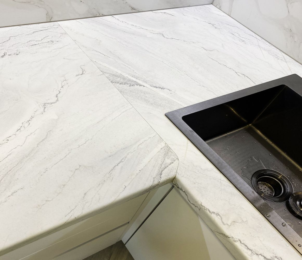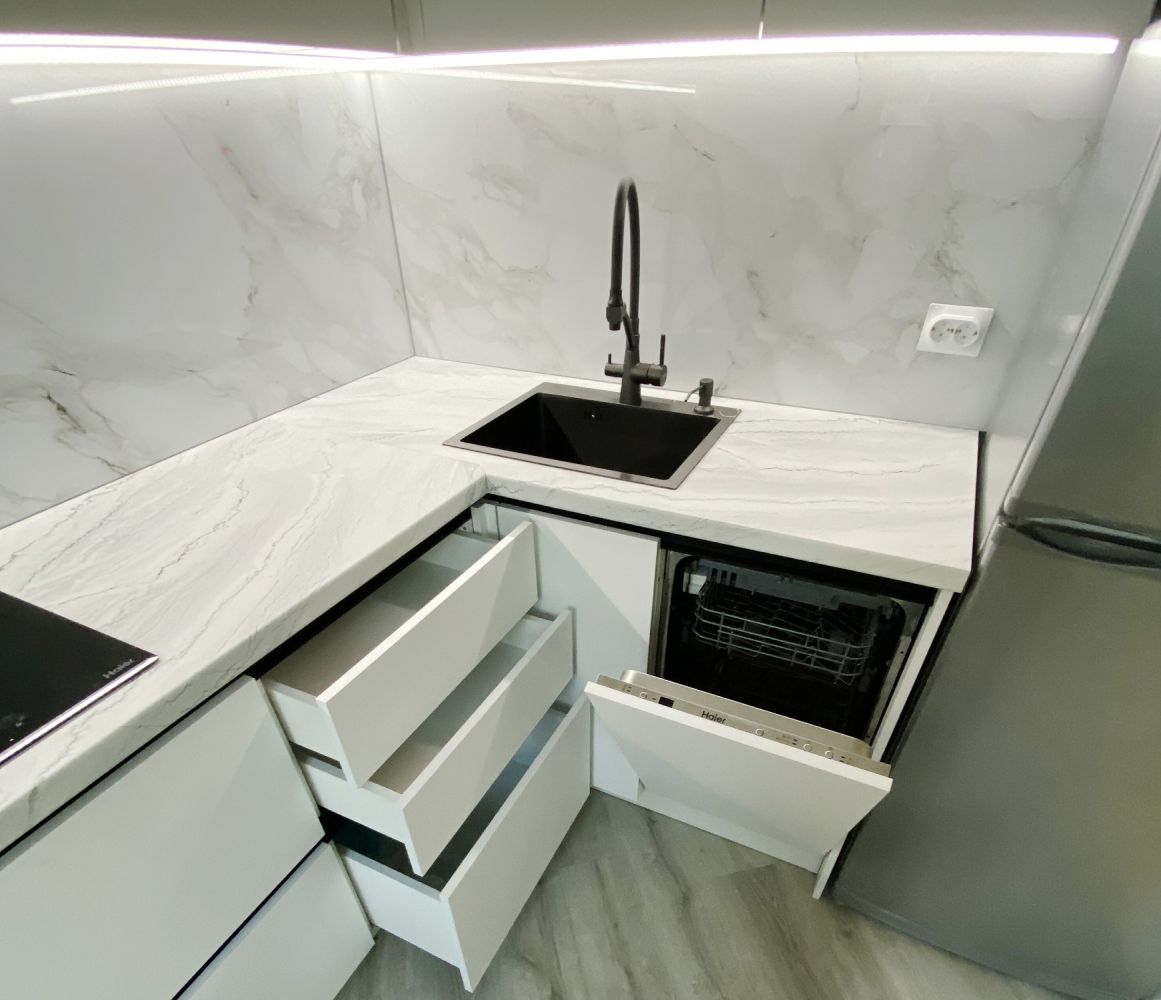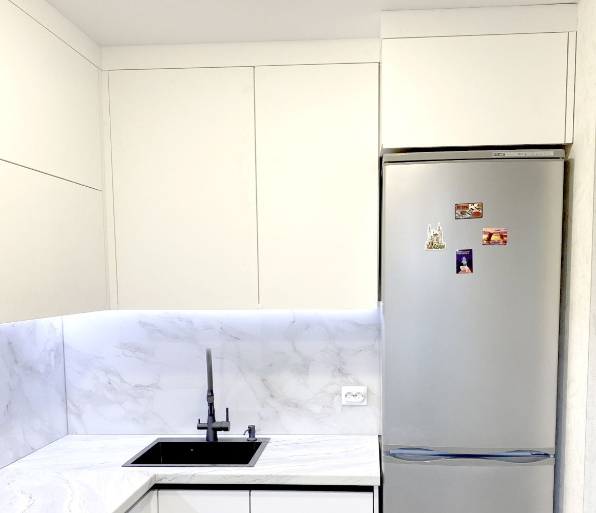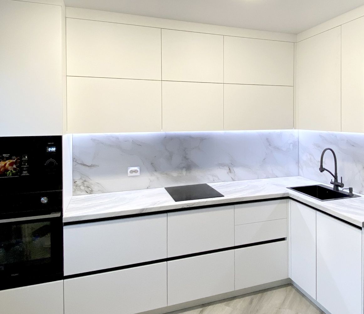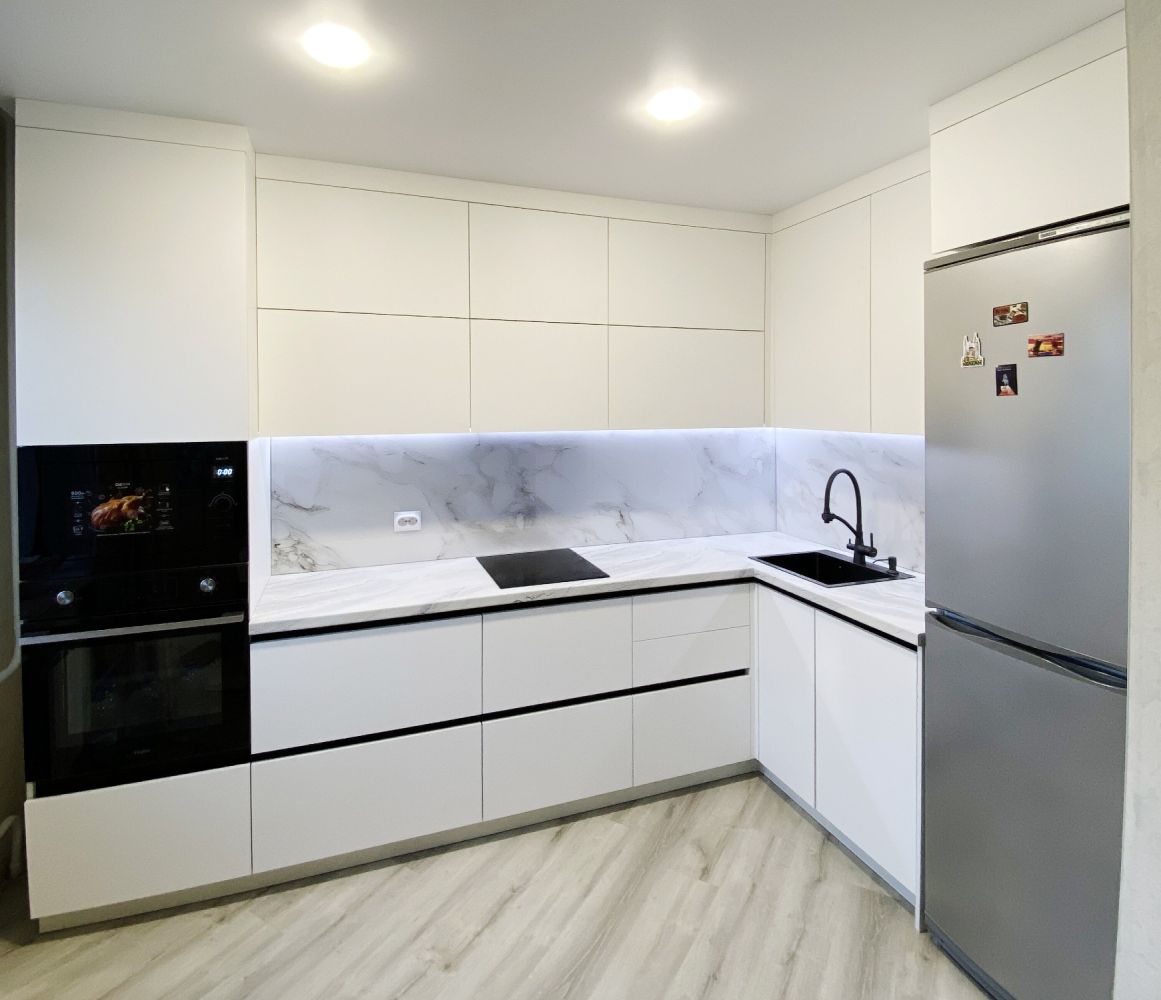 Современный кухонный гарнитур с пеналом под духовку и встраиваемая микроволновая печь. Фасады производства ТМФ SuperMat одностороний цвет Белая лилия. Они воплощают в себе современные тенденции и технологии! Покрытие у данных мебельных фасадов состоит из термопластичного Итальянского пластика! Они имеют повышенную стойкость к различным воздействиям, антибактериальные свойства и термовосстановление. Благодаря используемым новейшим материалам на поверхности фасадов не останутся отпечатки пальцев, а микроцарапины, могут быть легко удалены с помощью термической обработки.